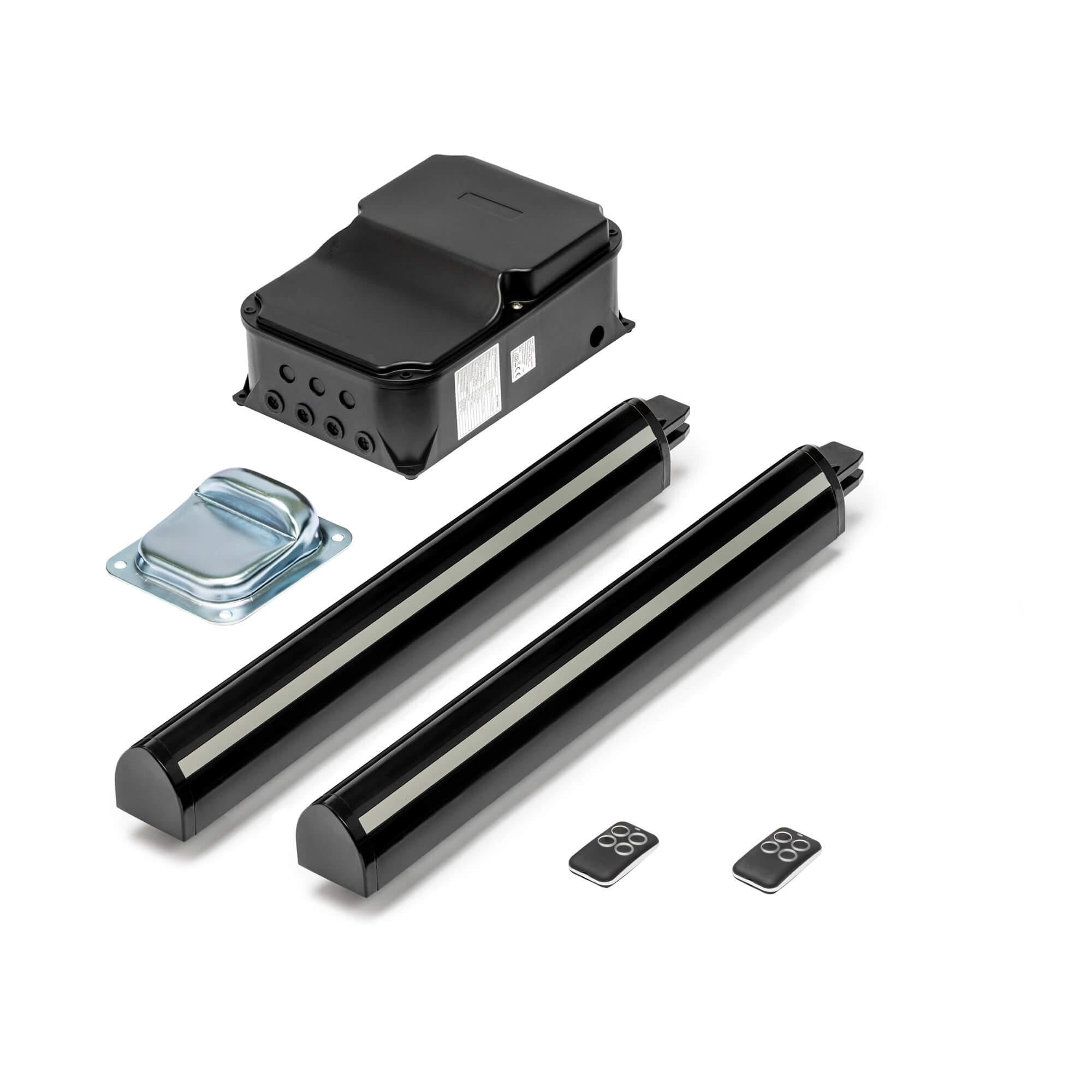 Zawartość zestawu: dwa siłowniki, centrala sterująca, dwa piloty, odbojnik, akcesoria montażowe, instrukcja i karta gwarancyjna.