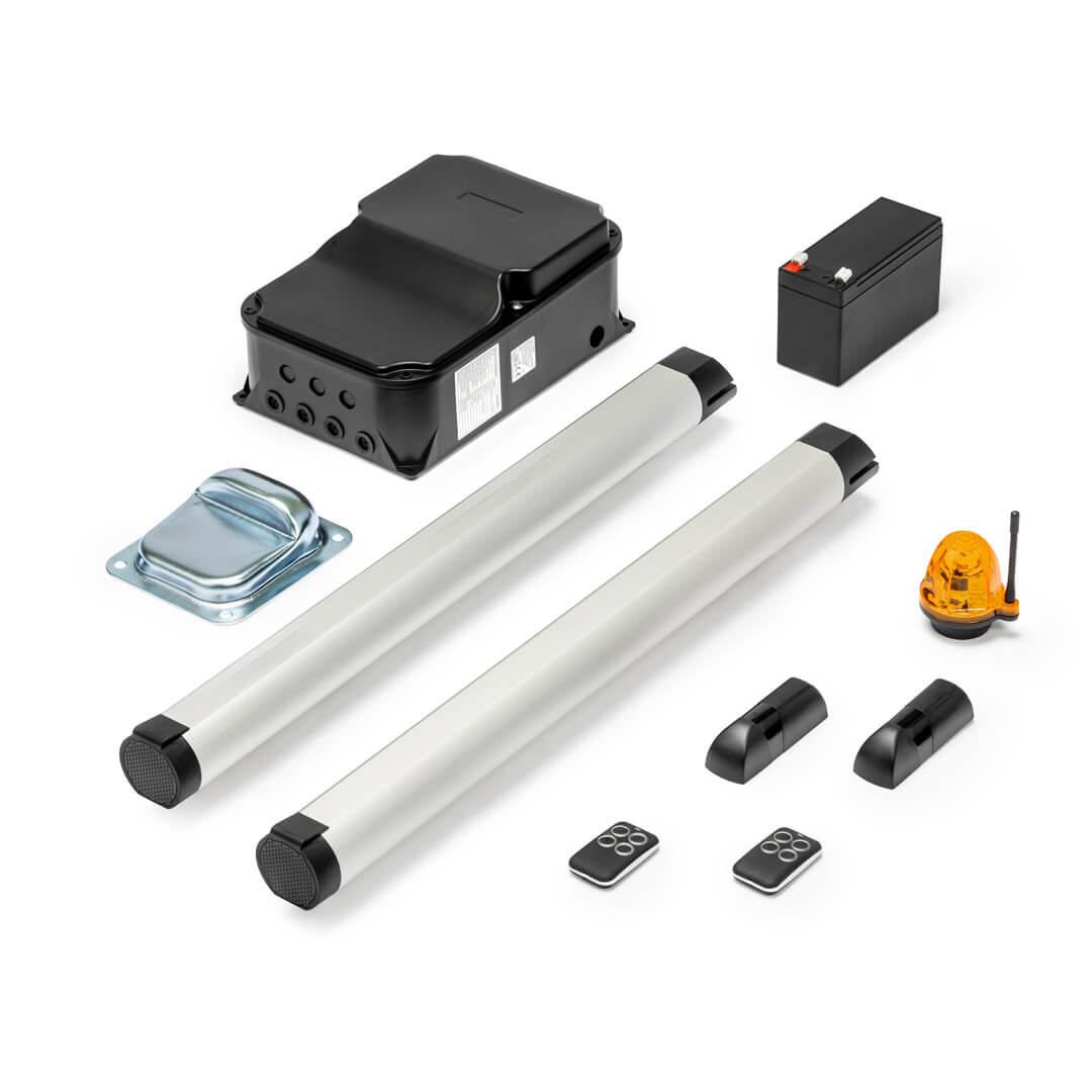 W zestawie: dwa siłowniki, centrala sterująca, 2 piloty, sterownik WiFi Tuya, technologia PowerSafe, lampa ostrzegawcza, fotokomórki, odbojnik i wszystkie akcesoria montażowe.